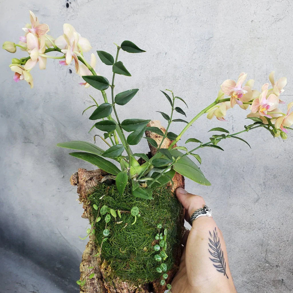 There are some specific plants that really shine when mounted, including most aroids like philodendron, monstera and syngonium. Also orchids, peperomia and epiphytic cactus do well on mounts. This is due to their growth habits in nature: they prefer to climb up or live on tree bark or rocks and gather nutrients from the rain, fallen debris and animals that inhabit the rainforest.
