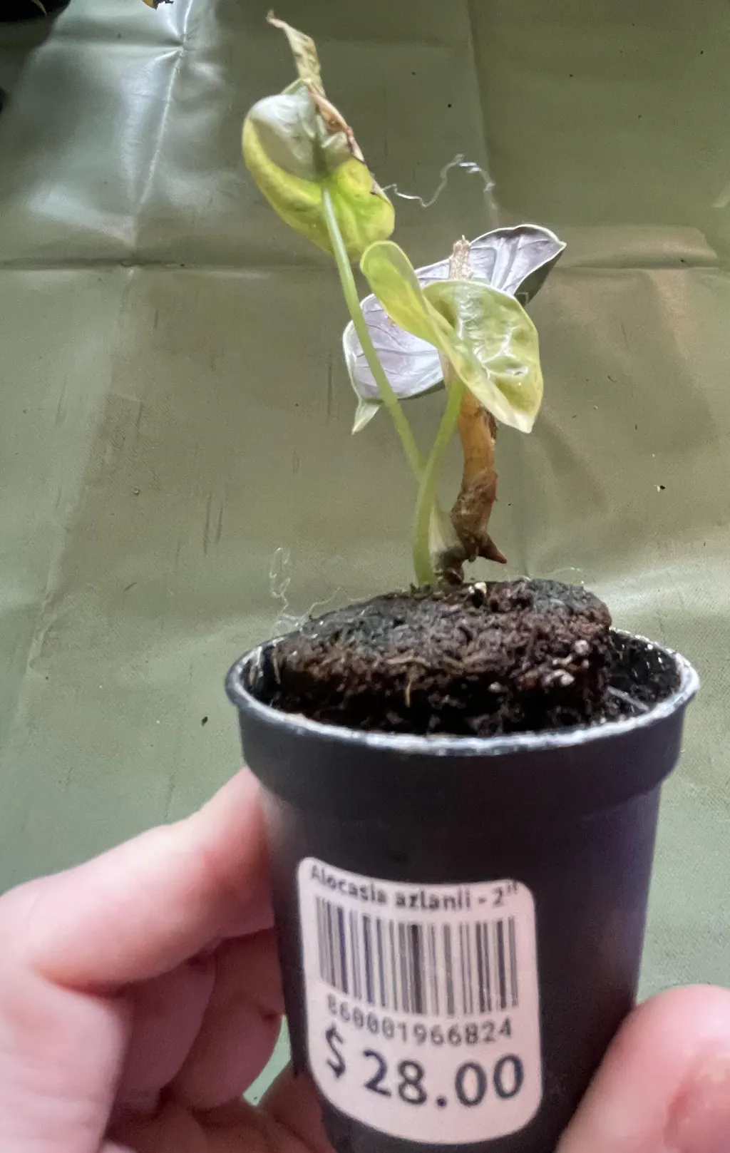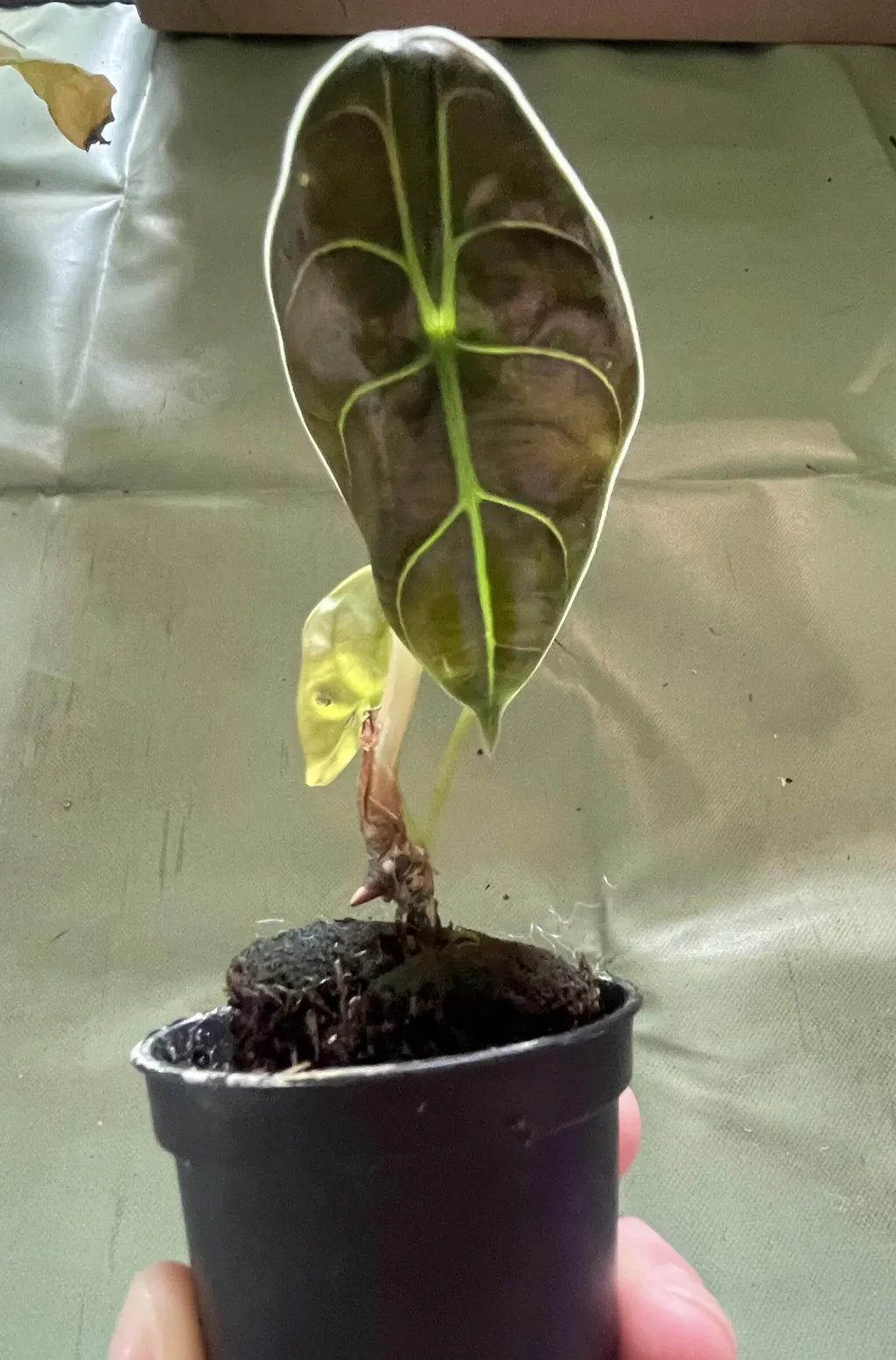 She arrived quickly! As alocasias are a bit finicky, her travels made her a little sad. I popped her in the greenhouse and can't wait for her to grow into her colors.
