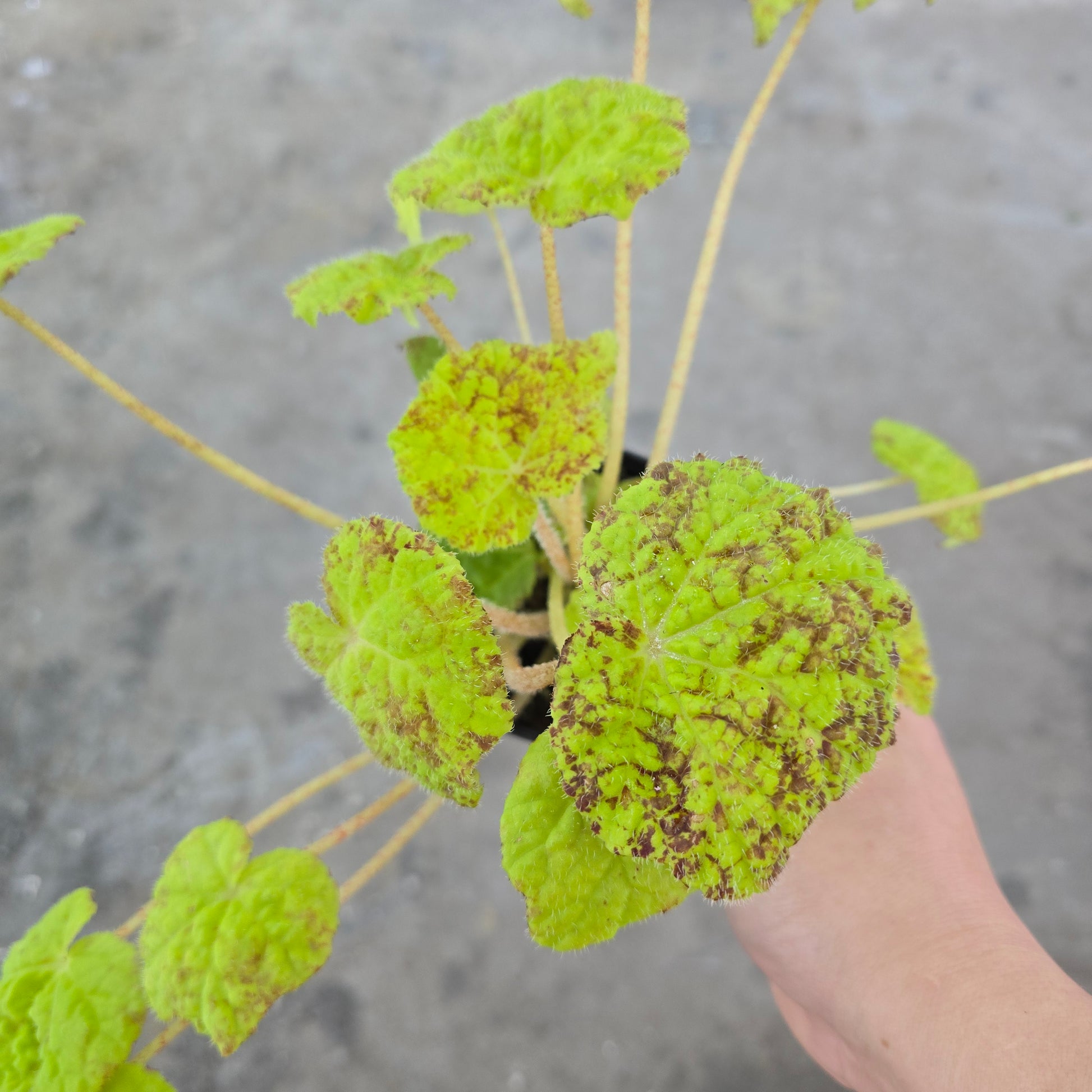 A vigorous rhizomatous hybrid known for its striking, asymmetrical chartreuse-yellow leaves heavily flecked with burgundy or chocolate spots. It is a versatile plant that serves as a bold indoor houseplant or a decorative addition to shaded outdoor gardens during warmer months.