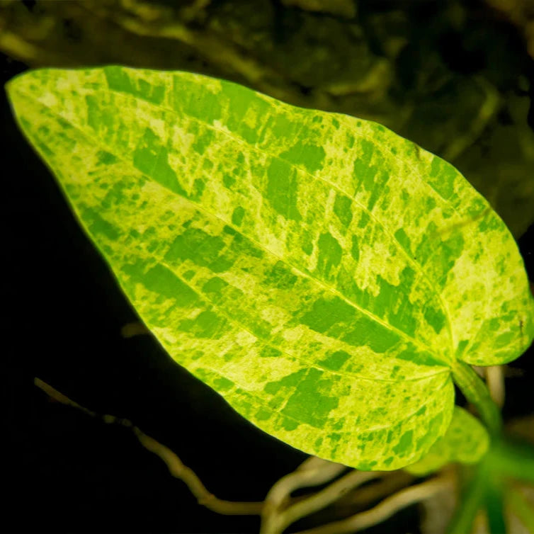Echinodorus cordifolius 'Marble Queen'. This variety of sword plant features vibrant green leaves with striking white or cream marbling. The leaves are generally broad and can grow quite large, making it a good choice for larger aquariums.