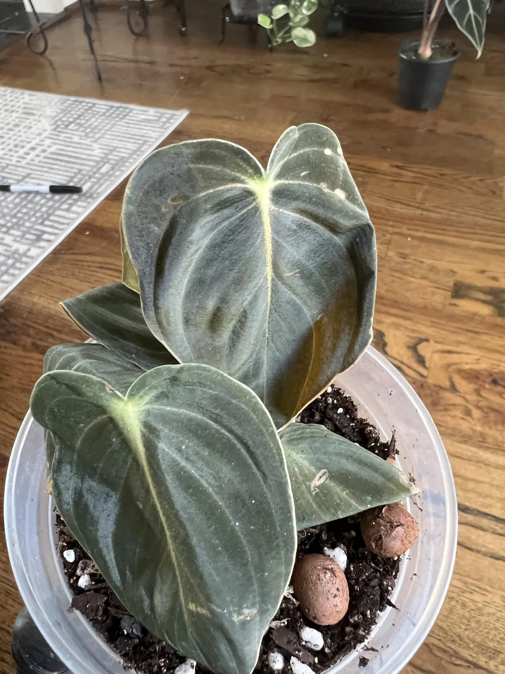Large velvety leaves emerges pink with light green veins maturing into a deep green. Plant does well with vertical structure otherwise it will trail and droop.
